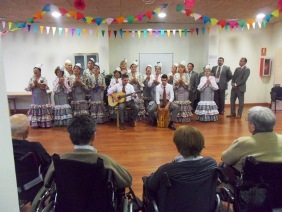 Así, la fiesta de los cumpleaños del mes se llenó de aroma andaluz con la actuación del Coro Rociero Acebuchal, que deleitó a los residentes con sevillanas y rumbas.